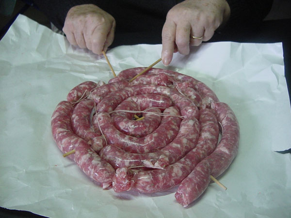 In Sicily sausage is called “sasizza” and butchers prepare it binding the sausages all together with some kitchen string making one big long sausage.