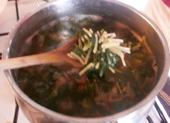 3. Cut the tenerumi in pieces with a sharp knife and when the water boils add salt (or the stock cube) and drop the tenerumi adding the garlic, the red pepper and the ginger.
