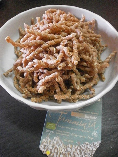 The typical pasta that accompanies this pesto are the rigorously handmade “busiati“(here on the right), but you can have it also with long-shaped pasta like spaghetti or linguine. (Here another recipe with the busiati).